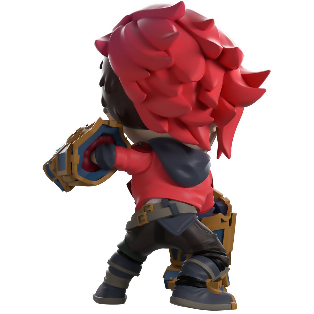 Vi's trekked her way into Youtooz in hopes of reuniting with her family with a Youtooz debut! At 3.8 inches tall and posed slamming a hefty gold and blue Hextech gauntlet into the ground as she raises the other behind her, ready to unleash a catastrophic final blow, scars cut through her eyebrow and pink lips as a ‘VI' is tattooed on her upper cheek. With the side of her head shaved down to short brown locks as the rest of her long pink hair sweeps to the side, she wears an open red jacket over a blue hoodie, dark striped pants and tall brown boots as a pair of belts wrap around her waist. The exterior of her dark blue packaging is covered in deep red and gold streaks running down its front. These then work their way onto the smudged red and blue interior, while the protective sleeve is a dark blue with a simple golden frame as her figure can be seen through the large clear window at the packaging's front.