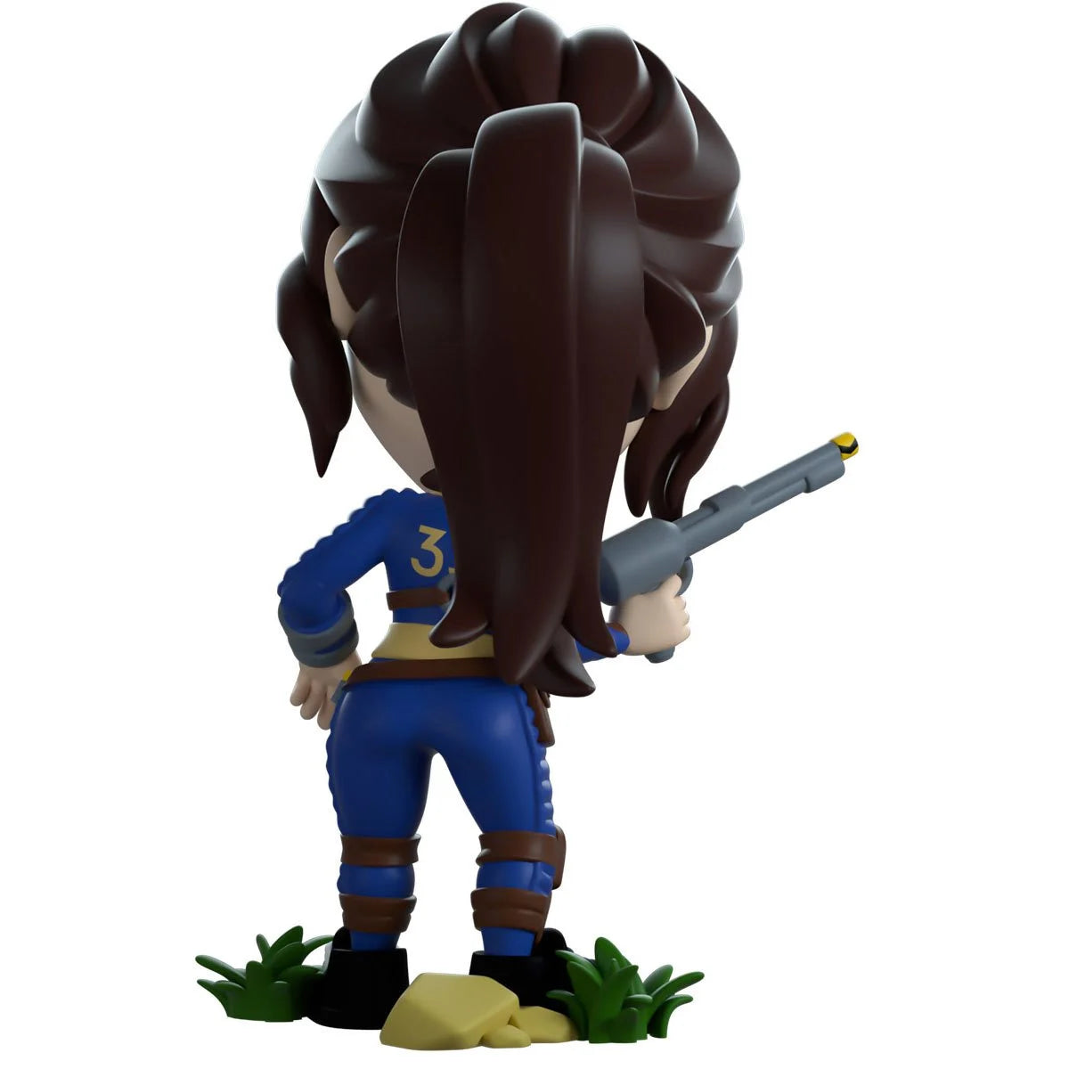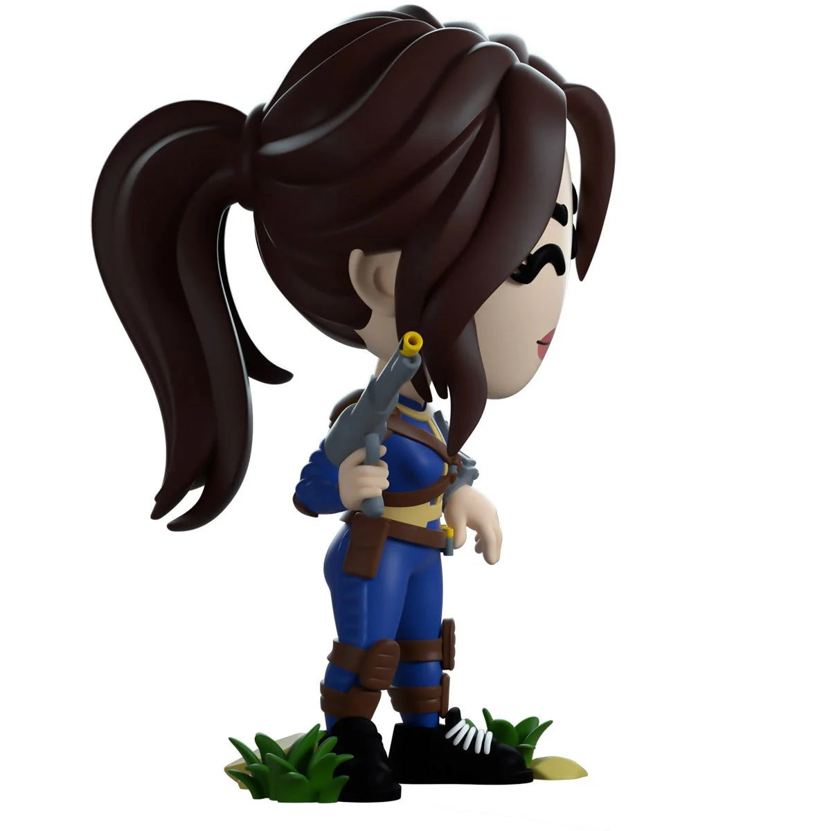 Lucy has emerged from the safety of the vault she's called home to explore the brand new world of Youtooz! Leaning to the side at just over 4 1/2-inches tall with a pink lipped smile curling across her face as her long brown hair falls down either side to frame it perfectly, the rest is pulled into a thick ponytail which falls down her back. Holding a long barreled pistol in her right hand and wearing a full body blue and yellow vault jumpsuit which is covered in brown straps and padded armor, her trusty grey Pip-Boy sits on her left wrist. The exterior of her packaging sees Lucy in a vast sandy wasteland and staring at a dilapidated building on the horizon. Interior is a dirty grey cement with blue and yellow vault colors painted across the top, which continues onto the protective sleeve as her figure can be seen through the large clear window at its front.