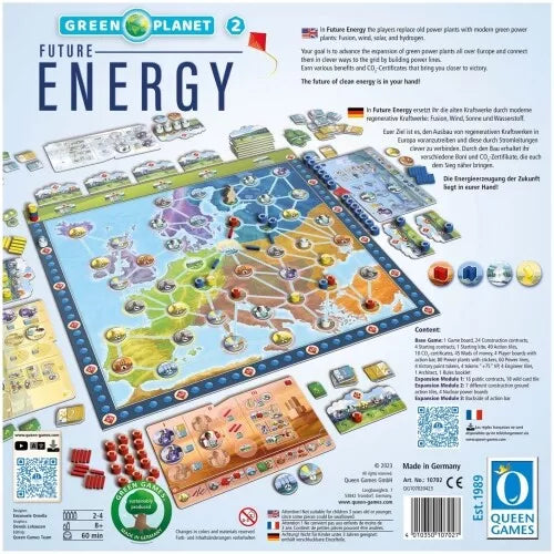 In Future Energy the players replace old power plants with modern green power plants: Fusion, wind, solar, and hydrogen. Your goal is to advance the expansion the expansion of green power plants all over Europe and connect them in clever ways to the grid by building power lines. Earn various benefits and CO2-Certificates that bring you closer to victory. The future of clean energy is in your hand!