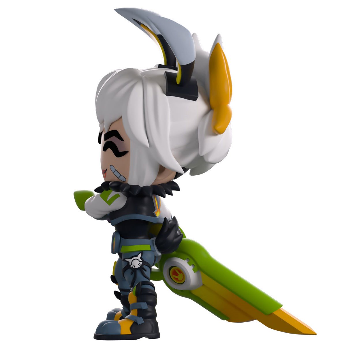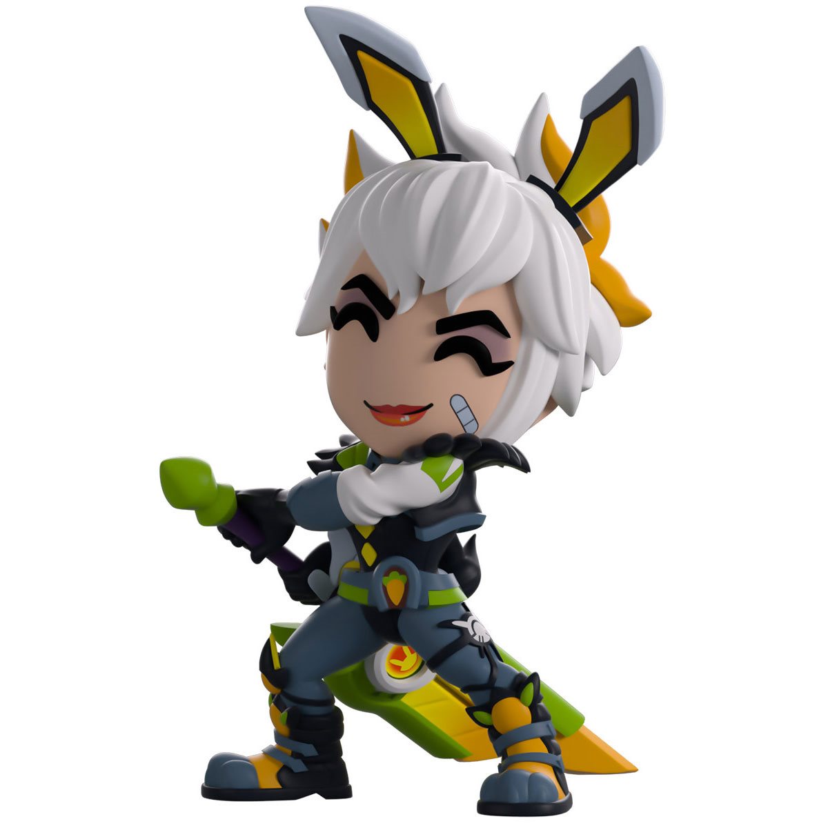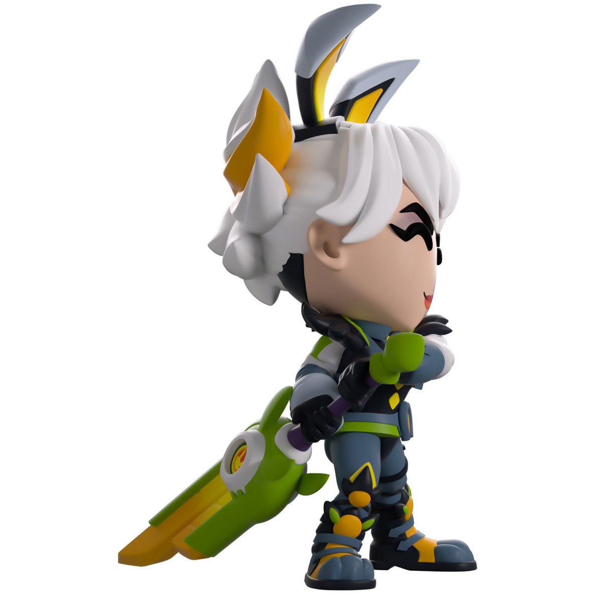 Riven has taken the middle lane to fight her way directly through to Youtooz! Standing at 5-inches tall and twisting her body as she prepares to swing her heft Runic Blade around with a devastating slash, her smirking red lips curl at the side underneath shadowed eyes as a lock of white hair frames her face and is pulled into messy strands at the back of her head behind pair of pointed bunny ears. Dressed in full Battle Bunny gear, she wears a cropped white jacket with a furry collar over a tight black leotard, along with grey pants and padded boots as a short white tail sticks out from her back. The exterior of her white packaging is covered in mint green dots and dark purple pop-ups, while the interior sports a pattern of diagonal arrows over its dark purple background. The protective sleeve then matches the green and purples of the exterior as her figure can be seen through the large clear window at the packaging's front.