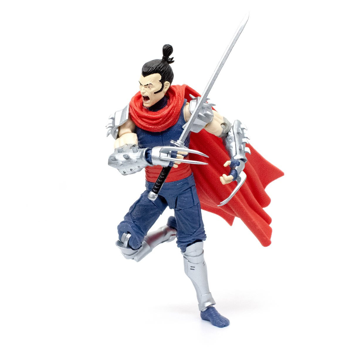 Straight from the pages of the TMNT IDW comics with sculpts inspired by Mateus Santolouco, The Loyal Subjects proudly unveils the ultimate Shredder action figure! Shredder has incredible detail! From the texturized weave effect on his clothing, the shine on his metal accents to his ripped muscles! Includes highly detailed metallic armor, steel claws, menacing horned helmet, and metallic plates that cover his arms and legs giving a textured and layered appearance, adding amazing depth to this sculpt design. Shredder drapes himself in a regal crimson-red cape, further enhancing his commanding presence and establishing him as an indomitable adversary. Displayed in a newly designed window box with the packaging artwork provided exclusively by Mateus Santolouco for The Loyal Subjects! The 1:15 scale, 6-inch action figure has 31 points of articulation for a variety of poses! Shredder comes with 1x katana sword, 2x sickles, signature TLS collectors' card showcasing unique artwork, multiple hand grips, 2x different dynamic head portraits with amazing expressions, and eye deco.