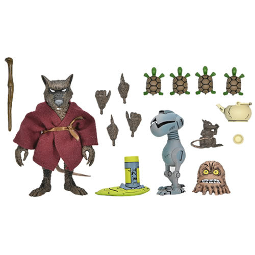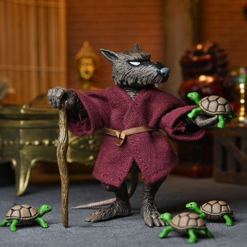 - This 4.5" action figure is in 7" scale and includes cloth robe, walking stick, broken TCRI canister, baby Turtles, tea pot and cup, Mouser, Utrom, interchangeable hands, and pre-mutation Splinter.